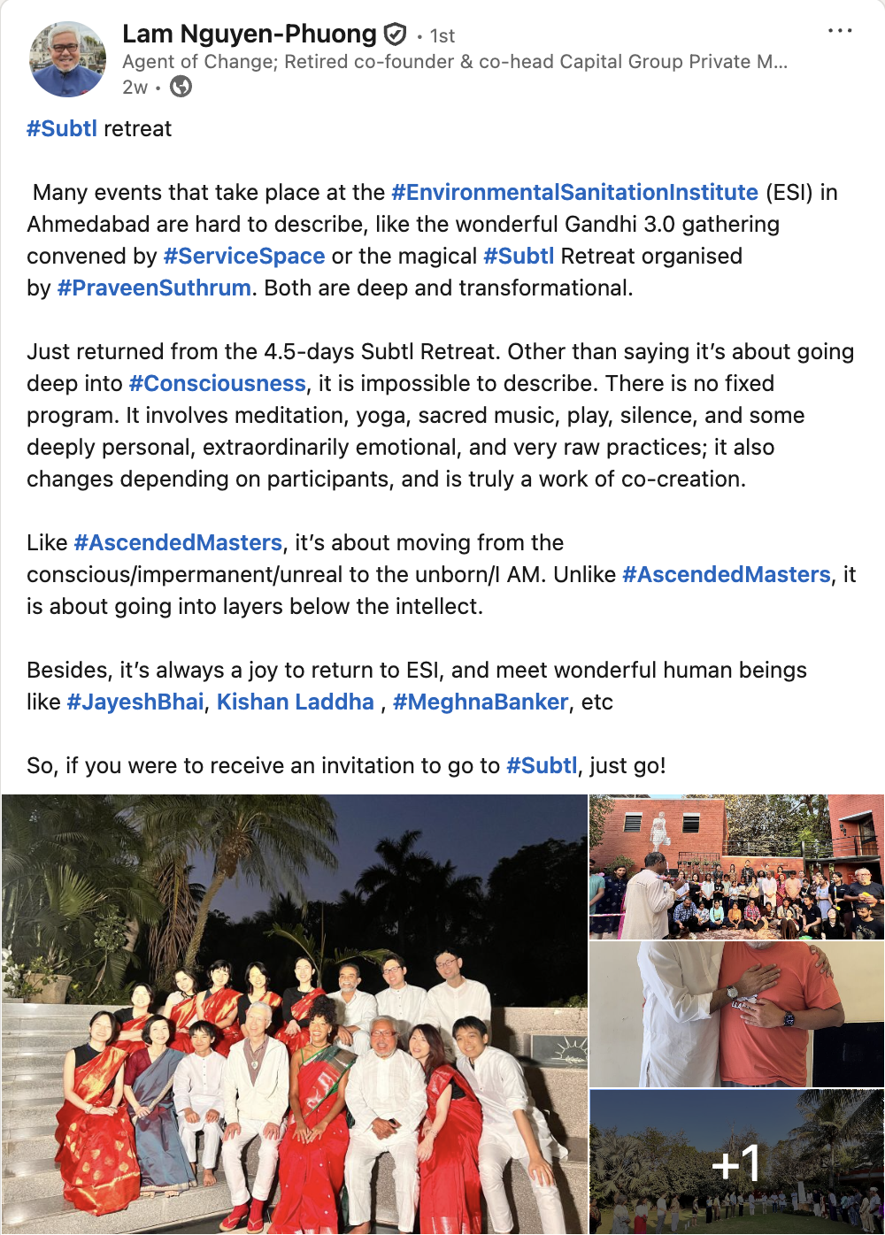 “Someone said at the end that subtl felt anything but subtle—and I relate to that. The sessions had us physically confronting anger and limiting beliefs. I entered with an open mind and just played in the process. A week later, I feel a lot more clear and focused. I’ve started a small yoga practice that ends in silence. I’m grateful to Praveen and the Subtl team for helping disentangle stuckness and allowing life energy to flow more gracefully.”